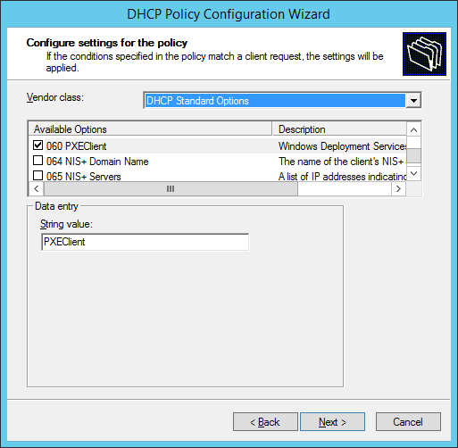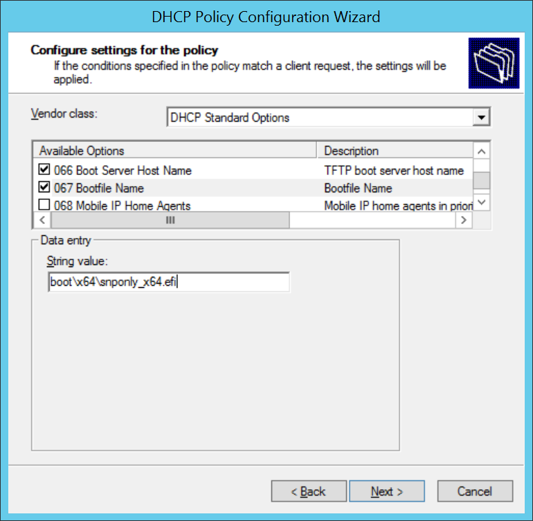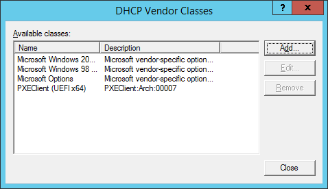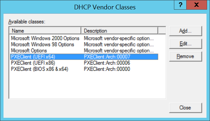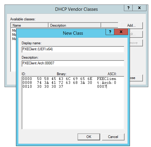 Keep in mind that there are x86 UEFI’s as well, and if these require support then you would define another Vendor Class with the value of PXEClient:Arch:00006. The 6 indicates x86 and 7 is x64, as per the table at the beginning of this article.