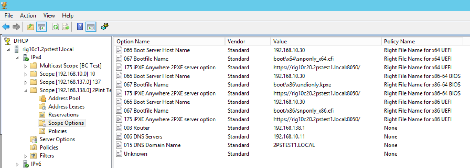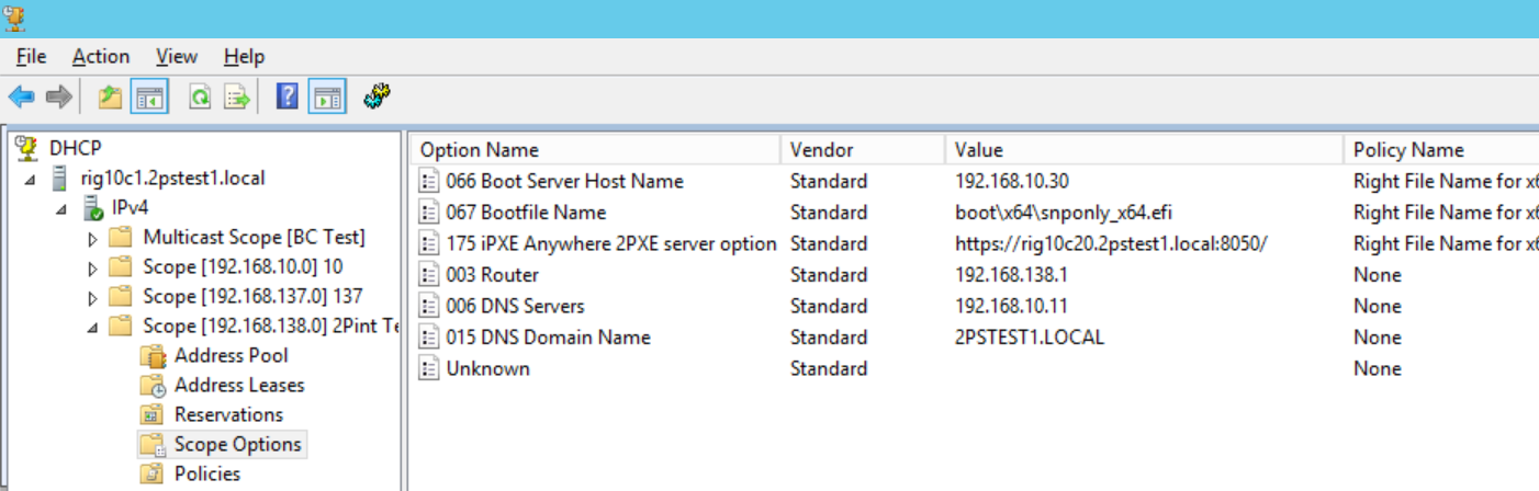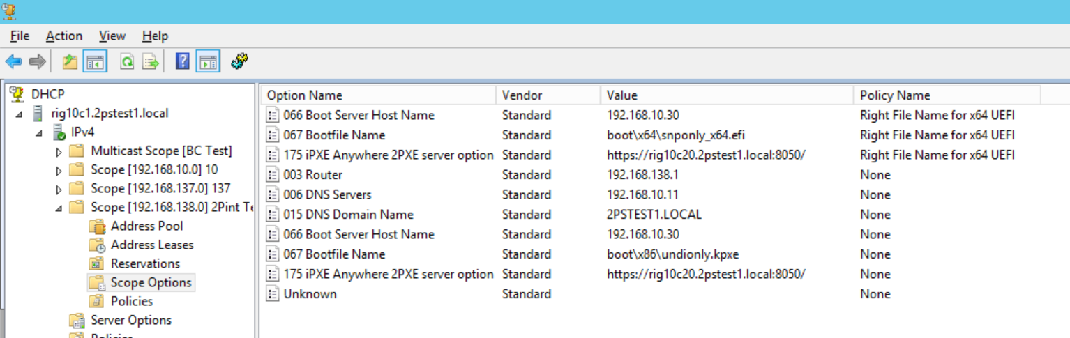 This is an example setup where the 2PXE server IP is 192.168.10.30 and the FQDN host name is PXE01.2pint.local and the default port is 8050. This guide will help you to define DHCP options to boot of UEFI machines as well as BIOS computer from the same 2PXE server, using DHCP options and thus bypassing the need & requirement for IP Helpers on the routers.