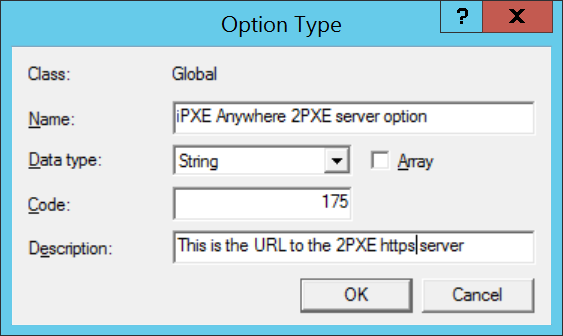 Once our PXE booted client needs to contact iPXE, it needs the FQDN URL of the 2PXE server. This is configured via DHCP option #175. This option does not appear by default, so it must be added.