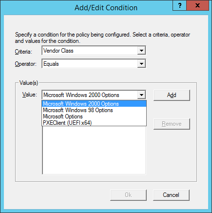 The AND/OR button doesn’t come in to play here as we will only have one rule. In the “Add/Edit Condition” page select “Vendor Class” from the “Criteria” drop down, and select the “Equals” Operator. Then select the PXEClient (UEFI x64) Vendor class from the list: