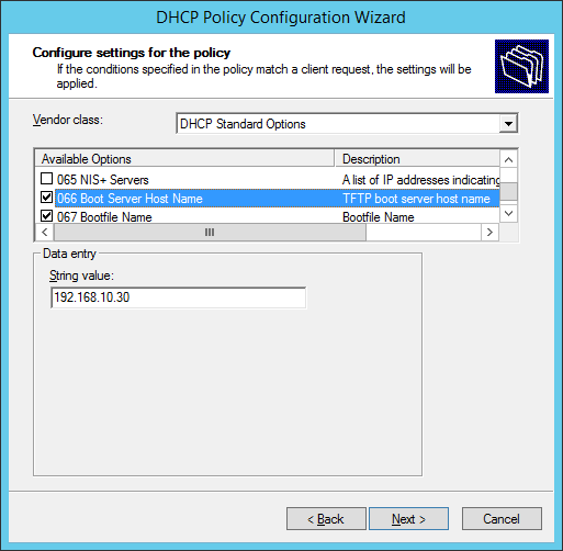 Next to configure in the wizard are DHCP settings. This denotes what is sent to the client once it matches the Criteria rule created earlier. Options 60, 66 and 67 are all required.