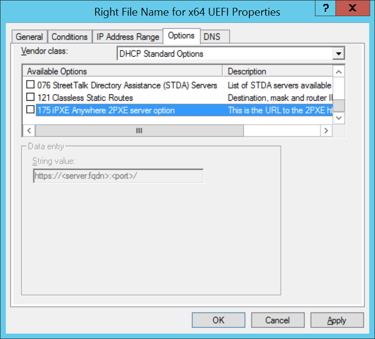 Next set DHCP option 175 to configure the 2PXE server DNS name