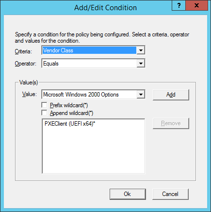 Ensure that the “Append Wildcard (*)” check box is selected as below. This makes sure that rest of the string is not used in the comparison. The smart people that clicked the RFC link and read a little will know that the entire Option 60 string looks something like PXEClient:Arch:00007:Undi:…. So it continues after 00007, hence the Append wildcard operator: