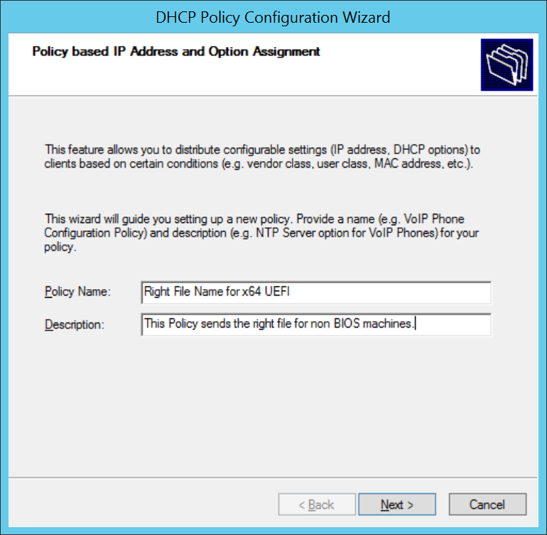 That’s it, we created our first Vendor Class and linked it to the data that a UEFI x64 client will send out in its DHCP request. Now, if you want you can create one more for x86 UEFI and also one for BIOS. The x86 UEFI one should appear as follows: