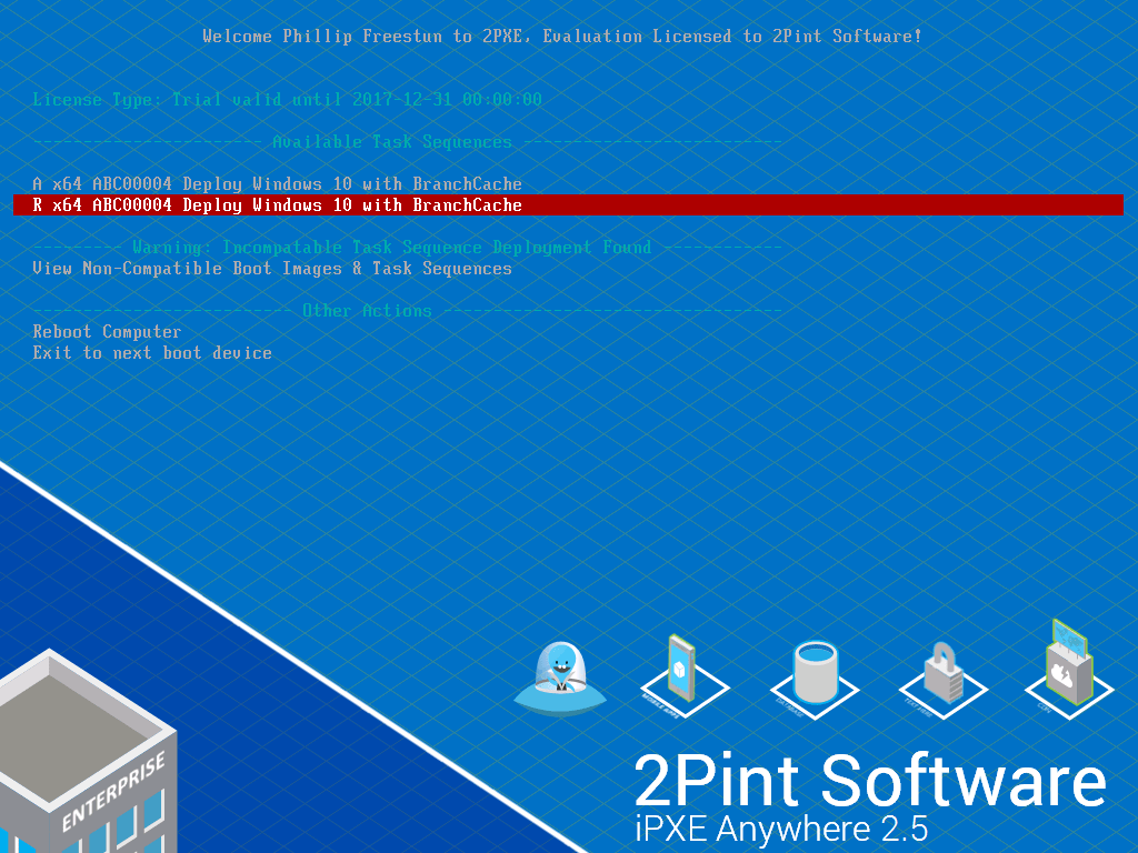 Figure 1 shows a Configuration Manager integrated menu from 2PXE, with 2 Deployments to the same Task Sequence. One set to Available (A) and one Required (R).