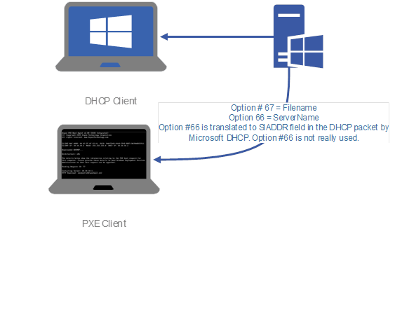 The below diagram shows how a Microsoft DHCP server gives out Option #66 and #67 can be used to boot a computer with iPXE.