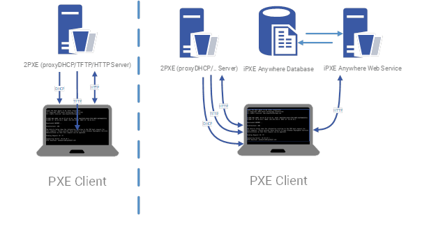 The following high level schematic shows the different setup just using 2PXE compared to integration it with iPXE Anywhere Web Service.