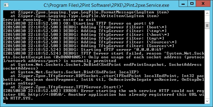 Figure 9 shows the 2PXE service running interactively, failing to bind to the HTTP port (due to the service already running).
