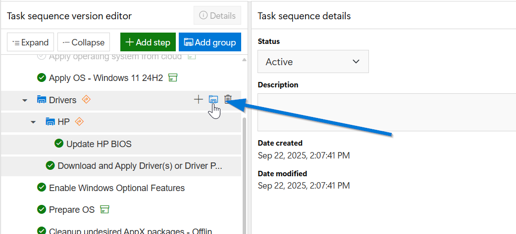 There are different ways to add groups.  The "Add group" button in the "Task sequence version editor" frame allows you to choose a step and have it added to the task sequence, by default, it will be added to the very end, at which point it can be moved to the desired location. &#x20;