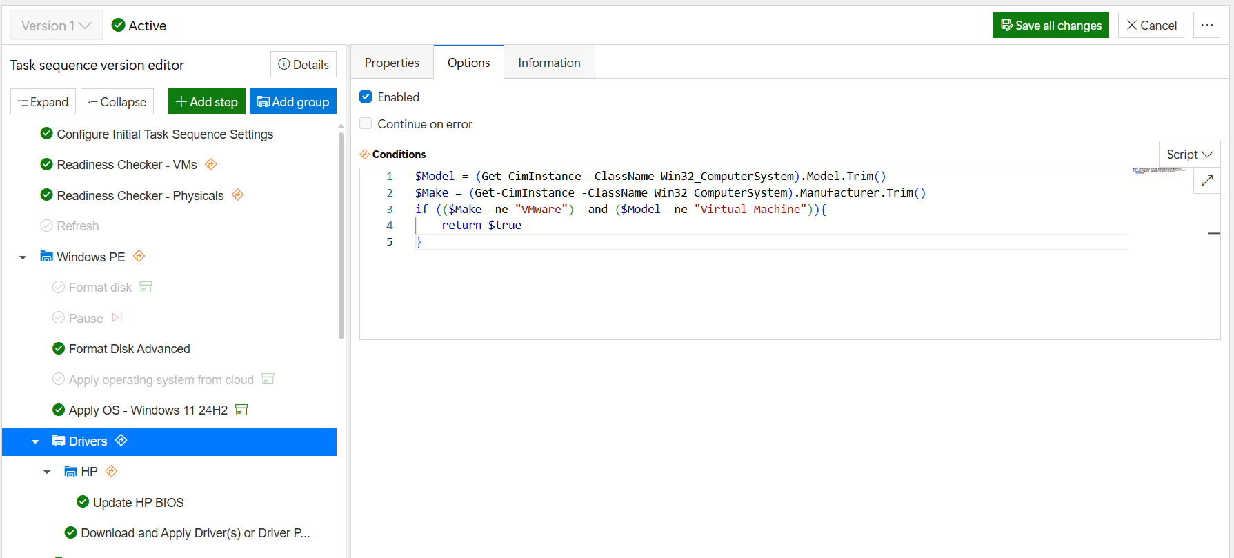 From the drop-down box, select "Script" which is also the default, then insert your script into the editor. In this example, the script is set to make the Drivers group run on all devices that are NOT virtual machines.