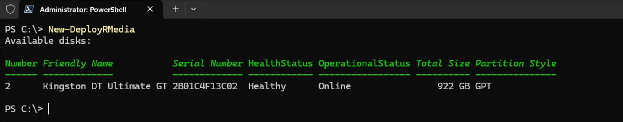 Then you can run the "New-DeployRMedia" cmdlet.  WIth no parameters, it will show a list of all the available removable USB devices that can be used: