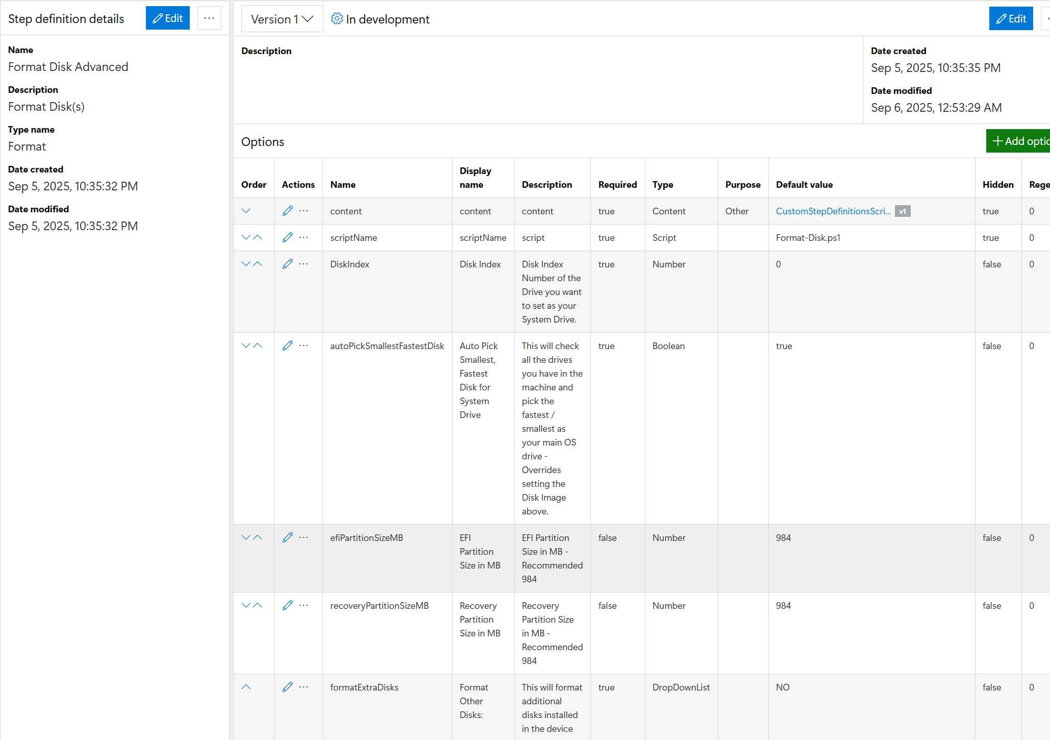 This step definition has several types leveraged to assist the user in determing which options they want to leverage.  It also is using a script: Format-Disk.ps1, which is located in the content item d819ff51-72a1-4e3c-bdf3-fcb69cf1bbab:1 .  When this step is triggered in the task sequence, it knows to download that content item, and run the Format-Disk script, and apply the parameters set in the step.  Lets look this step in the Console: