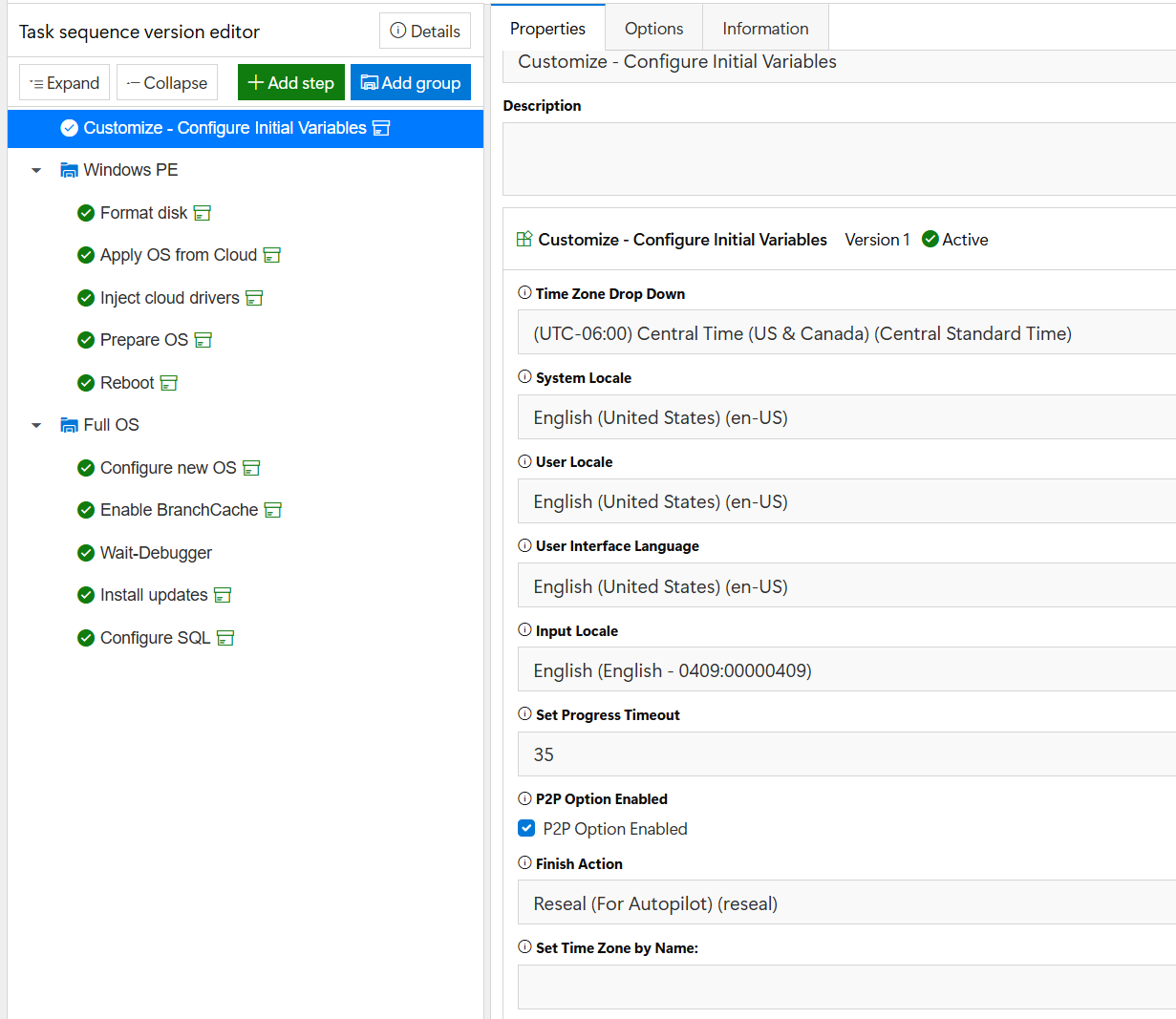 Some settings will also be wiped out via the reseal process for autopilot like time zone. Here is a list of a few of the variables you can set on this step for the task sequence environment: