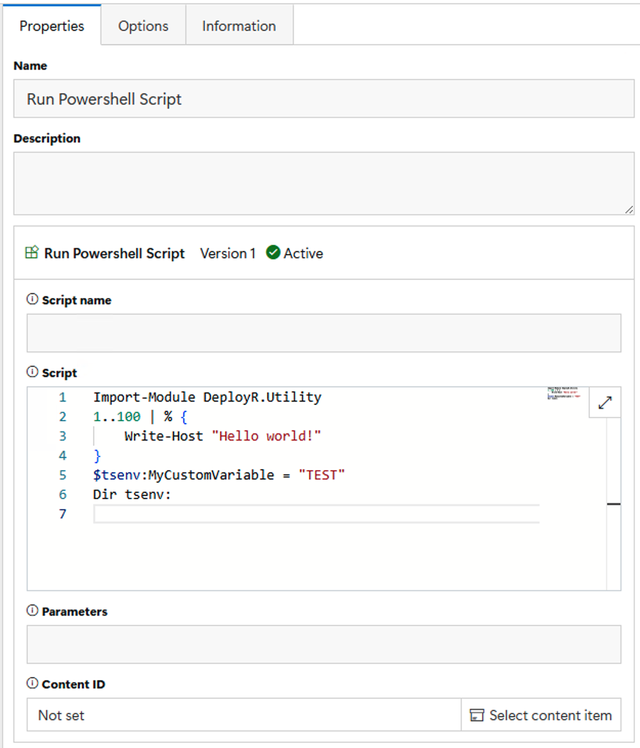 All output generated by the PowerShell script will automatically be captured by DeployR. Do not specify Start-Transcript or Stop-Transcript commands (they will fail).
