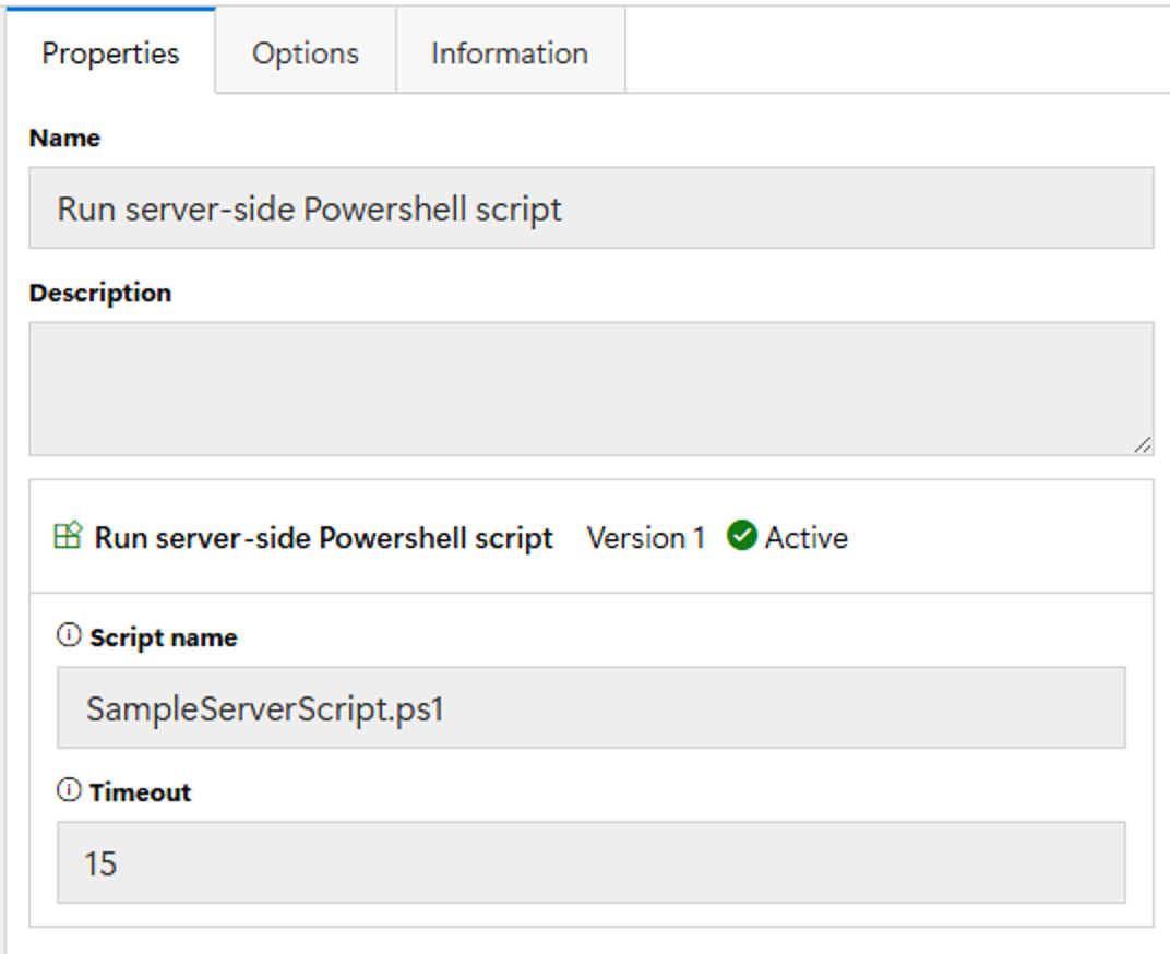 The **Run server-side script** step will run the specified script (e.g. "filename.ps1") on the DeployR server in the context of the service account.  It will receive the list of task sequence variables currently set on the client, and it can return back additional values that can be added to the task sequence environment.