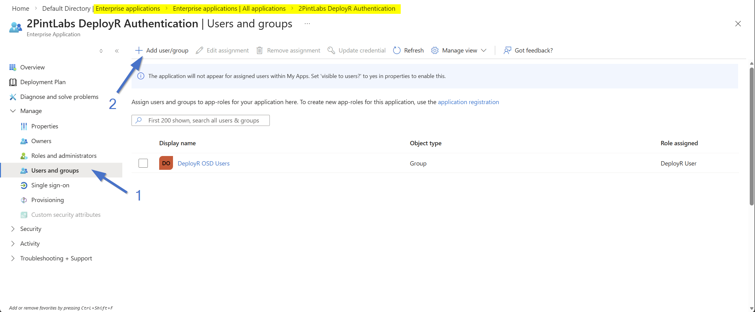 Switch to the "Enterprise applications" node in the Entra portal and find the application that you just created and configured.  Click on the "Users and Groups" node, then click to "Add user/group" and specify the user or group that should be granted access.  (Since there is only one role defined, that will be pre-selected.)  In this Example, a pre-created group called "DeployR OSD Users" was created and populated with Entra Users who will have rights to authenticate the DeployR OSD task sequences.
