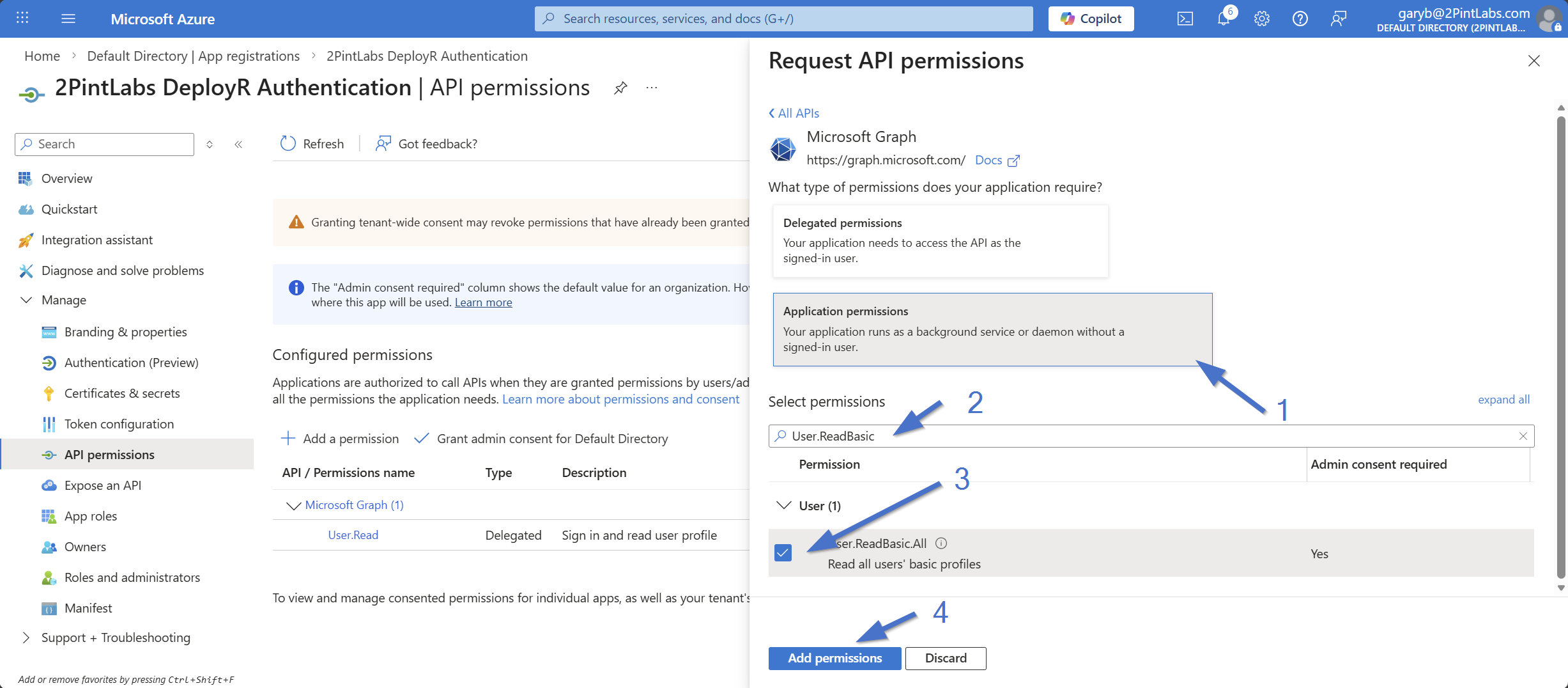 Once you click on "Microsoft Graph", it will expand giving you options.  Choose "Application Permissions", then search on User.ReadBasic, expand the "User" area, then check the box for "User.ReadBasic.All" and click "Add permissions"