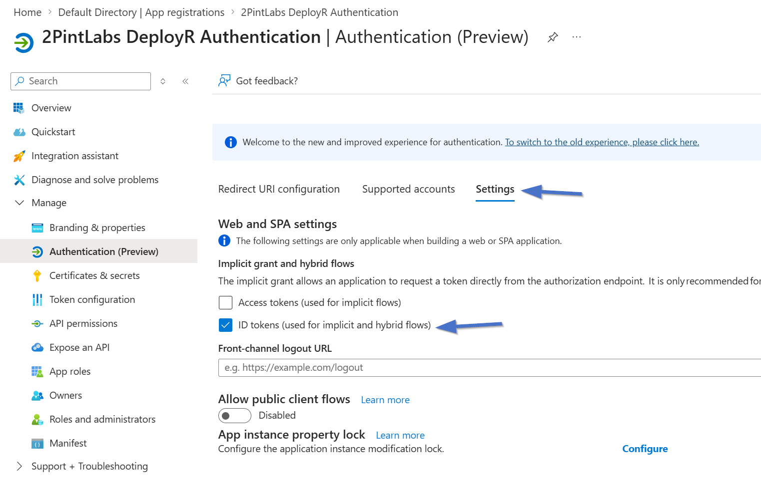 Back on the "Settings Tab, make sure "ID tokens (used for implicit hybrid flows) is set:
