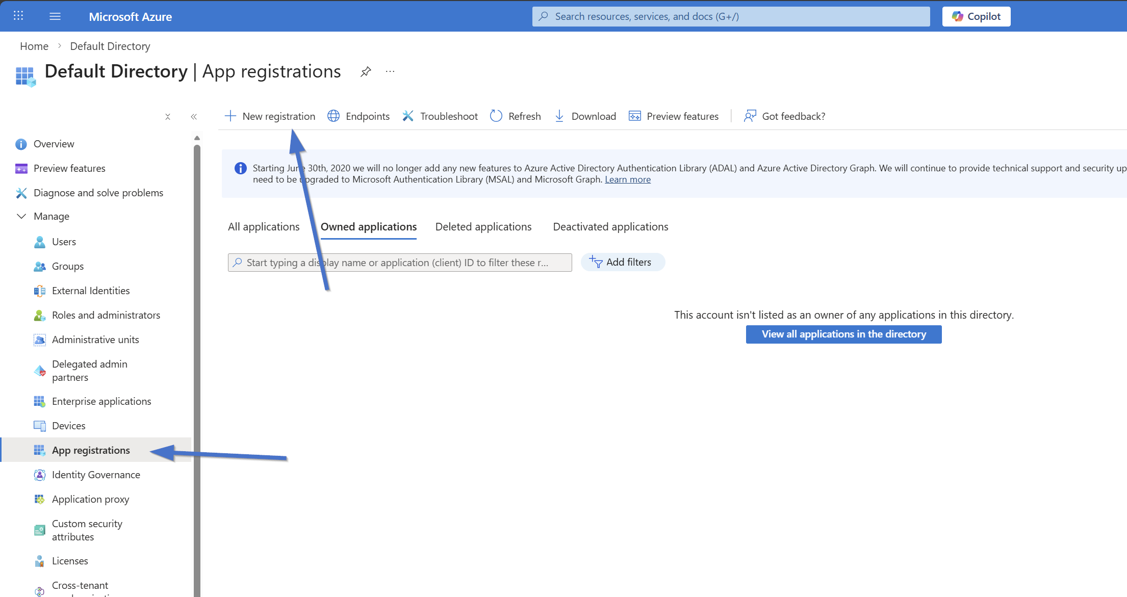To create an Entra ID application, log into [Entra ID](https://portal.azure.com/#view/Microsoft_AAD_IAM/ActiveDirectoryMenuBlade/~/RegisteredApps) as a global administrator or other user with sufficient permissions, then click "New registration" from the "App registrations" page.