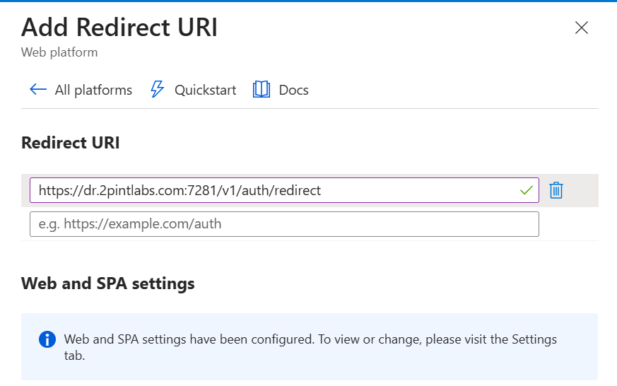 When asked for a "Custom redirect URIs" value, type "<https://FQDN:7281/v1/auth/redirect>" as shown below:[ <br>](https://dr.2pintlabs.com:7281/v1/auth/redirect)