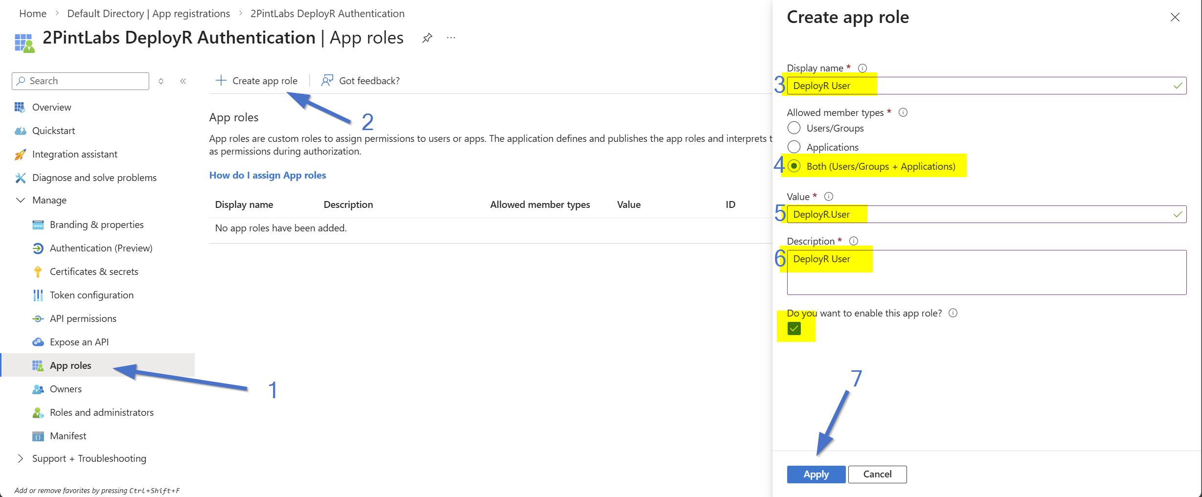 On the "App roles" page, click to "Create app role".  Fill in the values as indicated and then click "Apply" to create the role.