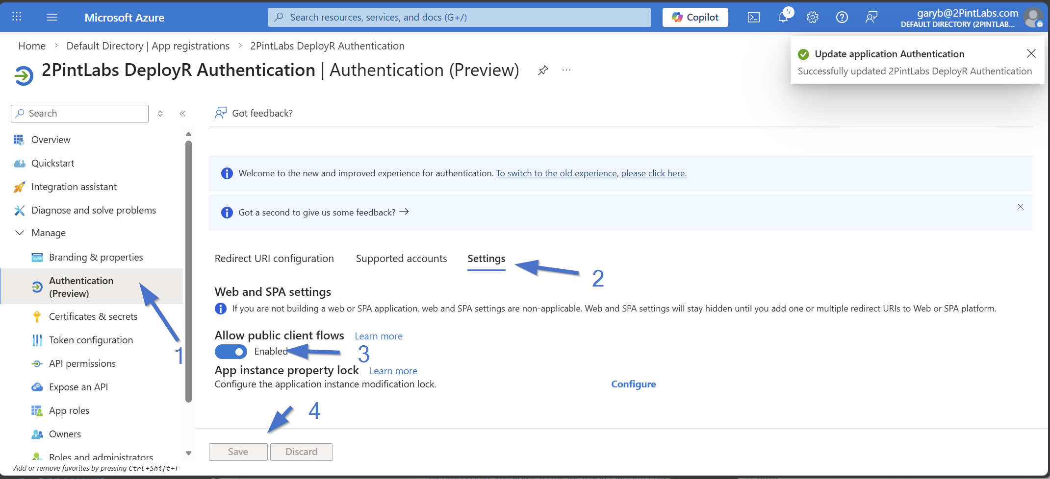 Click "Register to create the application.  One the applications' "Authentication (Preview)" page, click on the Settings, then enable "Allow public client flows" and save.