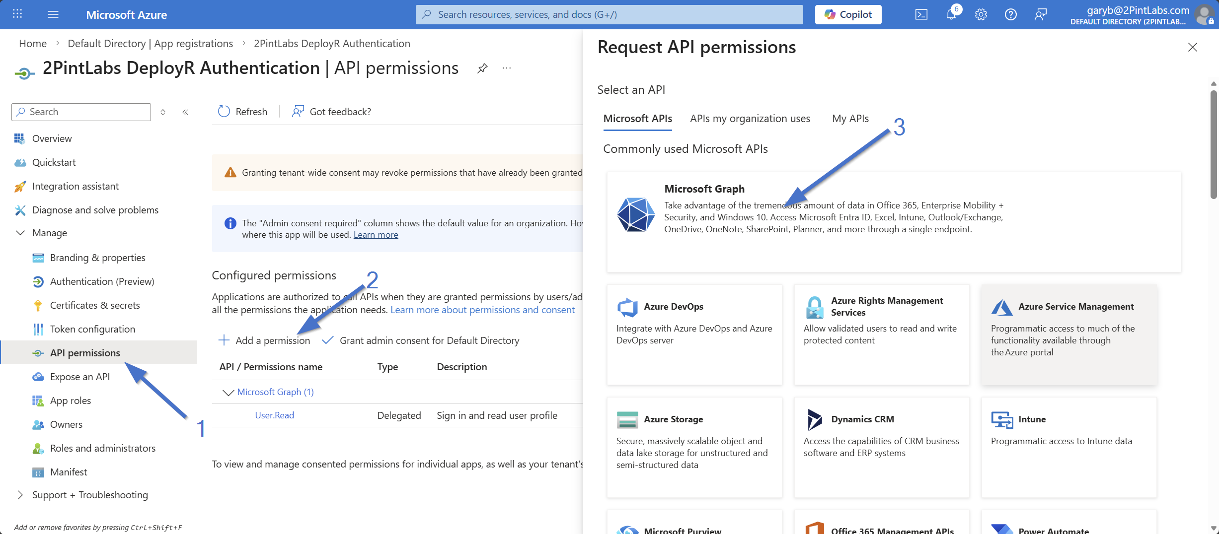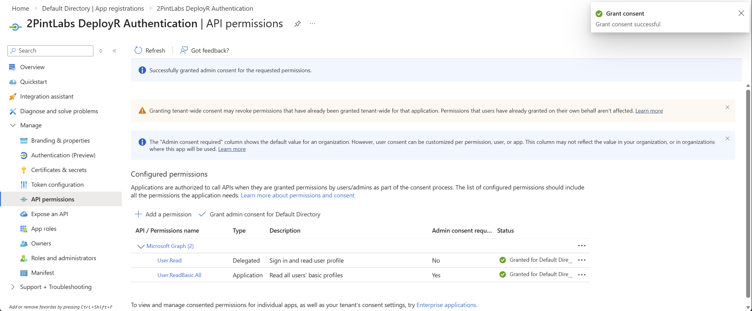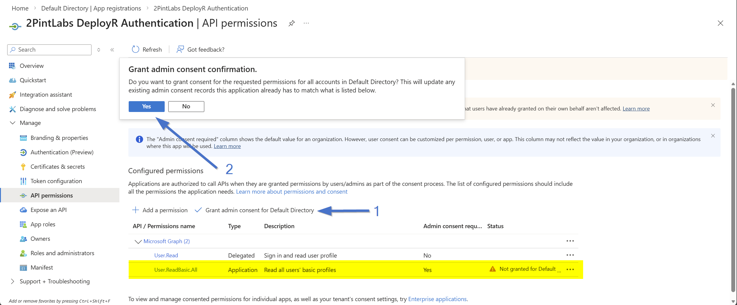 Once you've clicked "Add permissions", you'll now see this below, click on "Grant admin consent for Default Directory", a dialog will appear, click "Yes"