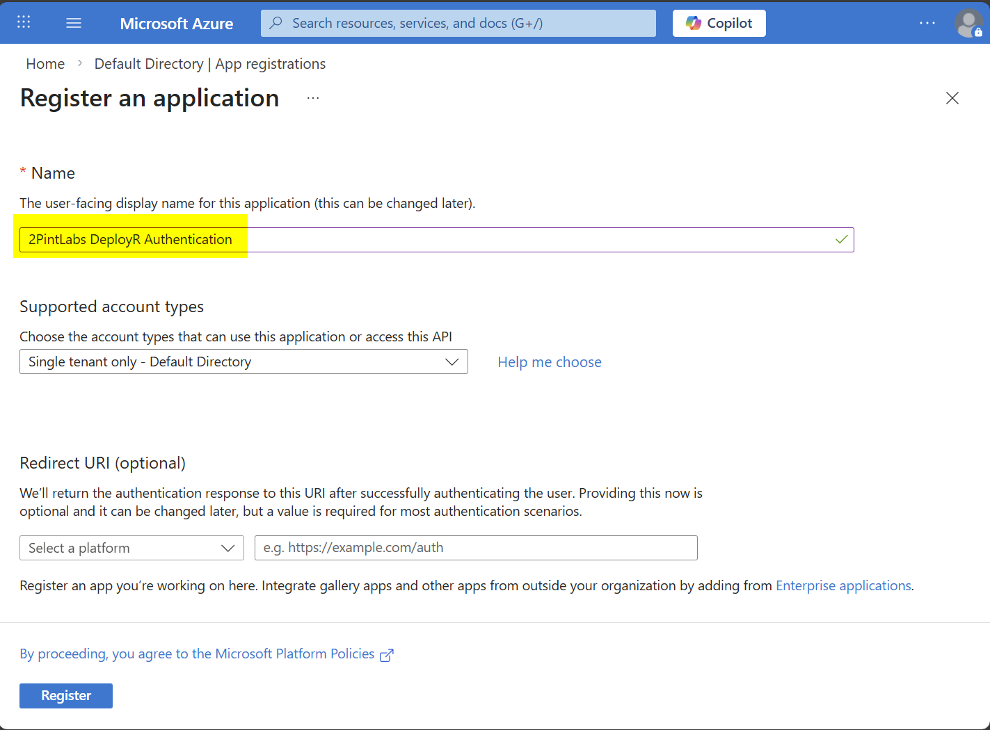 1. Create an Entra ID application that allows authentication of users in your Entra ID tenant.