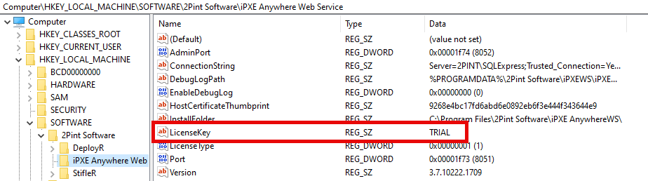 The iPXE Web Service license key is configured in the registry. Open the registry and navigate to **HKEY\_LOCAL\_MACHINE\SOFTWARE\2Pint Software\iPXE Anywhere Web Service**. Edit the **LicenseKey** value and enter in the new license key.