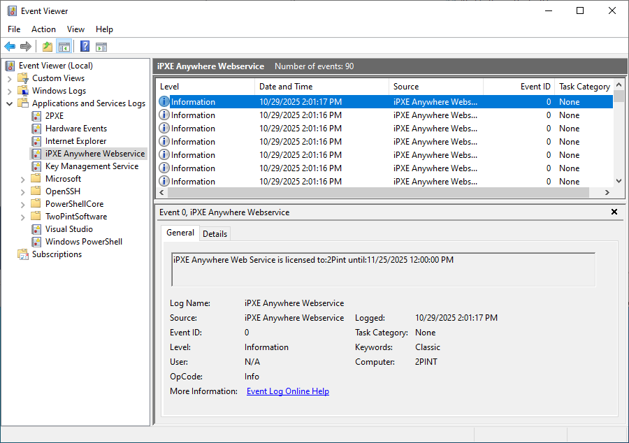 Restart (or start) the 2Pint Software iPXE Anywhere Web Service in order to apply the new license key.