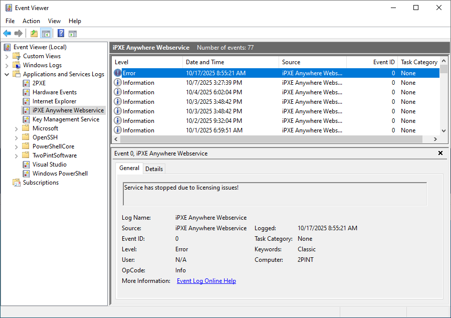 If there is an issue with the license key (expired, wrong license key, etc.), the following event will be displayed: Service has stopped due to licensing issues!