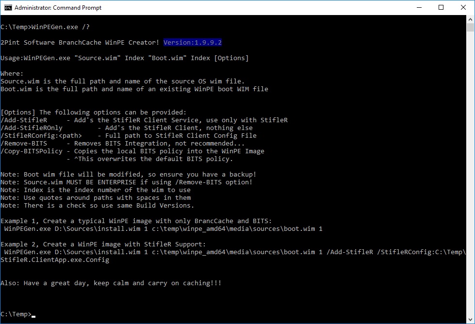 The tool used to create a BranchCache enabled image (WinPEGen.exe) is simply run from the command line as shown below.