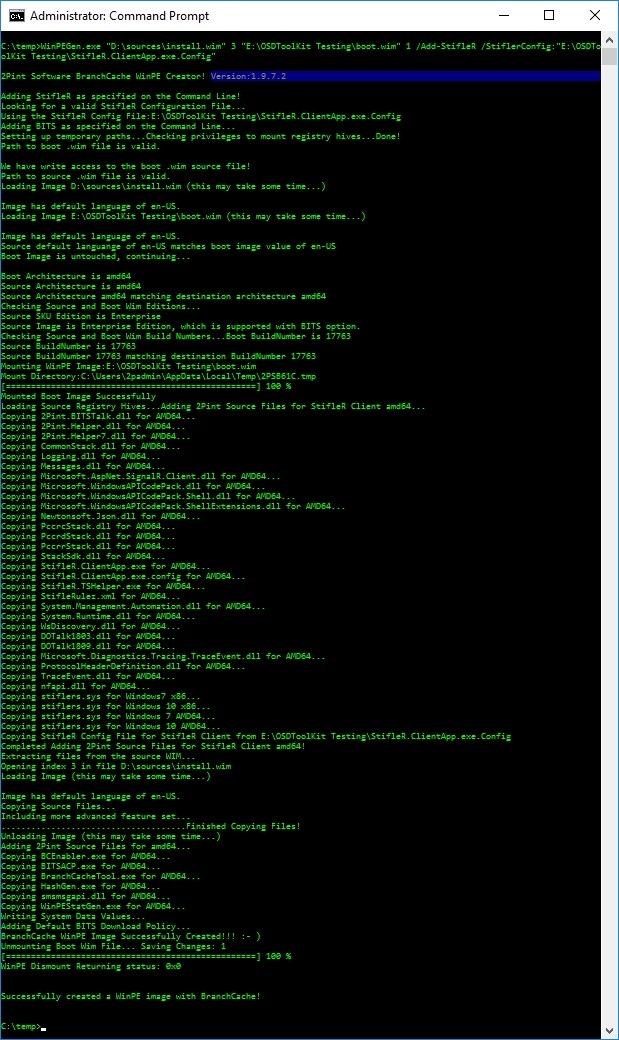 Assuming that all goes well, the executable will complete and generate the BranchCache enabled boot.wim file.