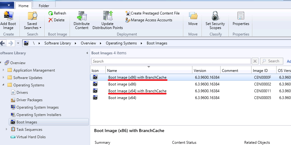 Figure 1 shows WinPE images that have been enabled with BranchCache imported into Configuration Manager, ready for use.