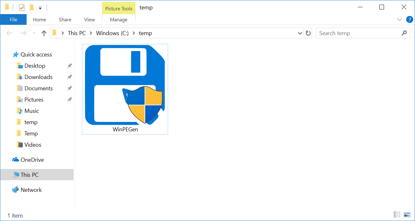The following explorer window shows the setup of files in this example. We have copied the x64 generator executable to the C:\Temp\ folder