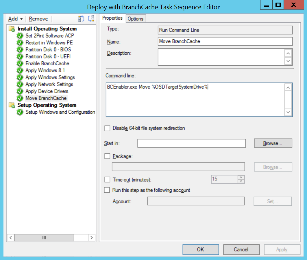 Once you have a BranchCache enabled WinPE image it’s time to edit the task sequence to enable BranchCache and configure the Cache Location.