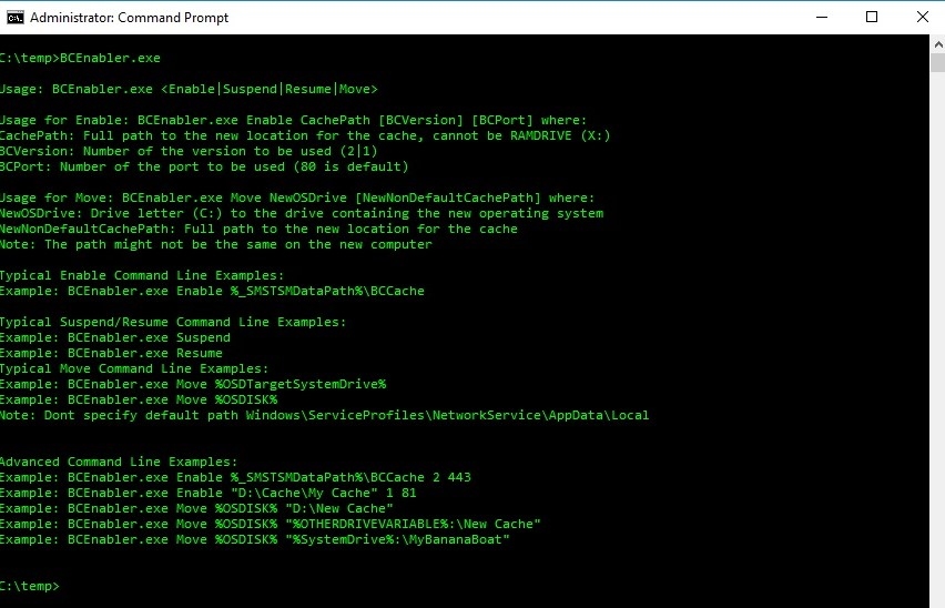 BCEnabler.exe Move %OSDISK% "%OTHERDRIVEVARIABLE%:\New Cache"