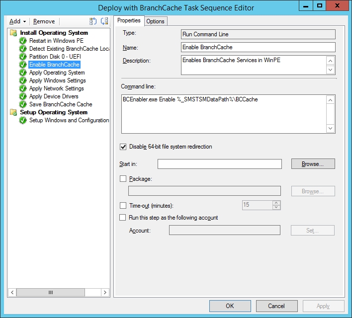 Figure 7 The Enable step in the task sequence that starts the BranchCache components. It is run directly after the Partition step, allowing caching to start as soon as the disk is active.