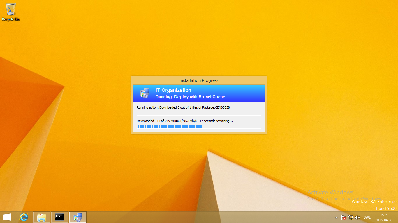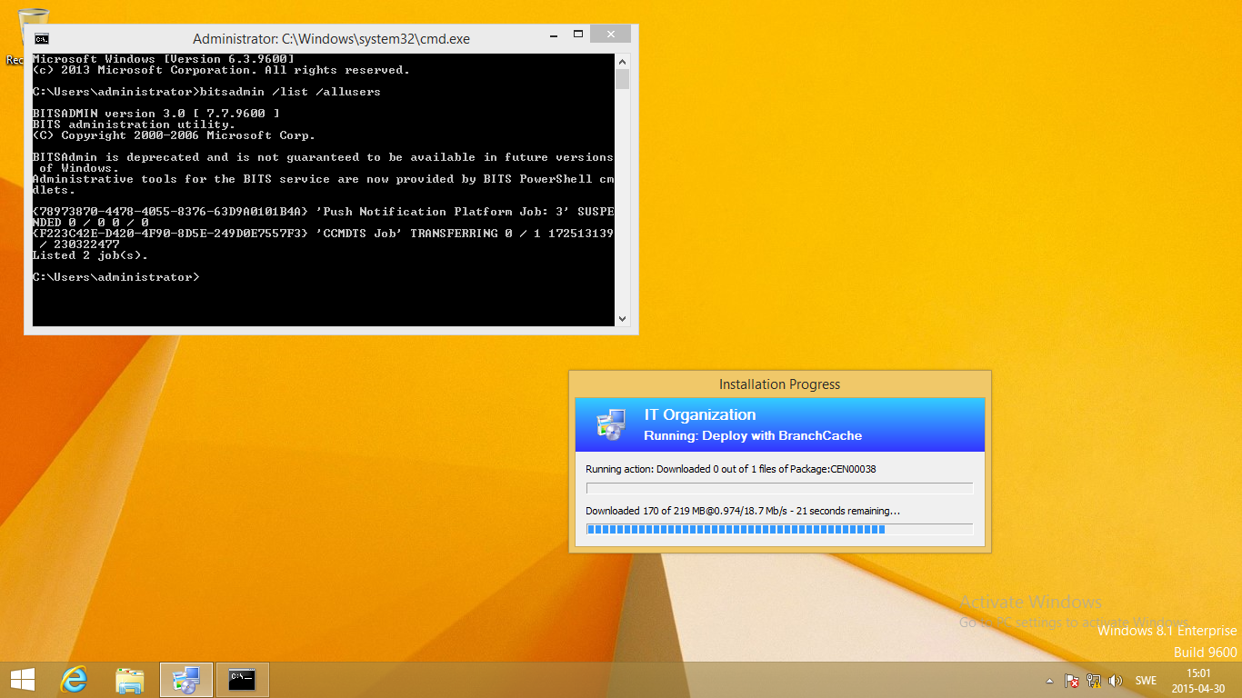Figure 16 A Windows Pro Machine is downloading packages in a task sequence using BITS & BranchCache. Although scheduled to run at 1Mb/s (WAN) it is caching local content at 61Mb/s from already cached content from its peers.