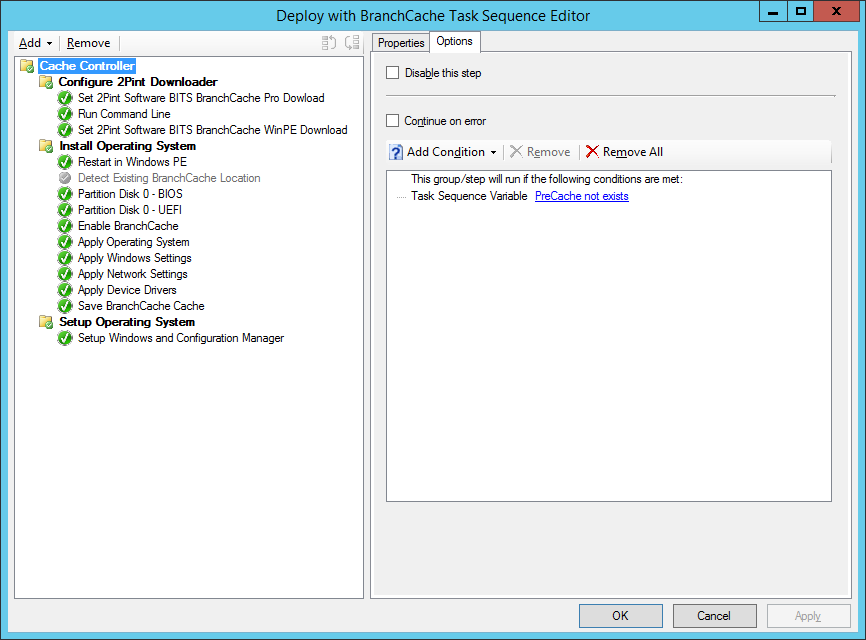 With this configured as above you can now pre-cache the entire content. Please make sure you have a valid condition on the Task Sequence (shown below) that will prevent the sequence from actually running. In the example below the PreCache variable is checked on the top folder, causing the underlying TS to not be executed. Since the download is initiated before the task sequence starts it will download all content, start the task sequence and then exit out as the PreCache variable is set.