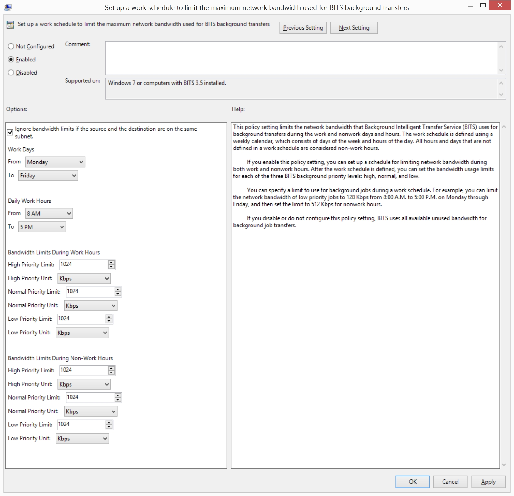If you enable this policy setting, you can set up a schedule for limiting network bandwidth during both work and non-work hours. After the work schedule is defined, you can set the bandwidth usage limits for each of the three BITS background priority levels: high, normal, and low.