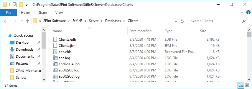 The StifleR databases are using the Extensible Storage Engine (ESE) runtime in Windows (ESENT), and as such are often called ESENT databases. In addition to the core database files, the EDB files, ESE is also using recovery logs which are in the same folder as each database file.