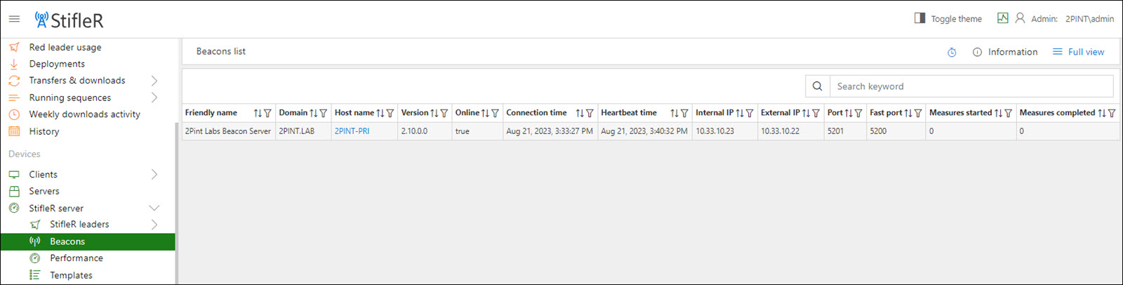 The Beacons page displays a list and status of all of the StifleR Beacon servers reporting into the StifleR server.