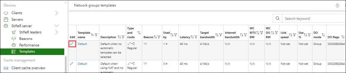 To add a Beacon server to a template, in the StifleR Dashboard, under Devices - StifleR server select Templates. In the Network group templates list, find the template you want to modify, and select the edit icon.
