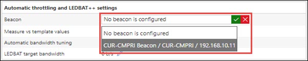 In the Network group template editor, locate the "Automatic throttling and LEDBAT++ settings" section. In the Beacon field, select the pencil icon. Select the box which appears and a drop down list should open which lists the Beacon servers that have reported into StifleR. Select the Beacon Server you would like to add, and then click the green check mark to save the setting.