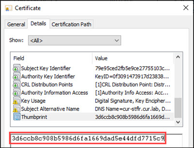 Select the Thumbprint field. In the value box, you should see the certificate thumbprint. This can be copied by using the hotkeys CTRL-C. It is important to capture this value to add to the StifleR Config file when implementing HTTPS in StifleR.