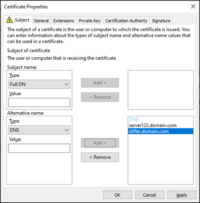At the "Certificates Properties" screen, in the "Alternative name" section, use the Type drop-down and select DNS. In the Value field, enter the FQDN of the StifleR server on which the certificate will be installed. You can also add additional values for DNS (CNAME) Aliases. Click OK to save the settings.