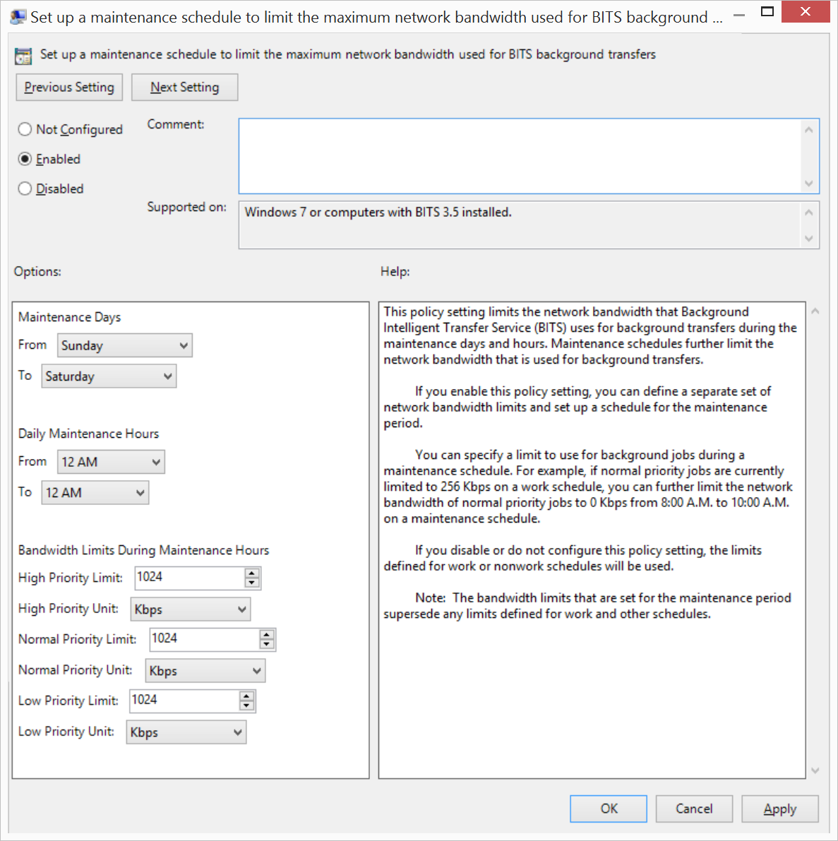 This policy setting limits the network bandwidth that Background Intelligent Transfer Service (BITS) uses for background transfers during the maintenance days and hours. Maintenance schedules further limit the network bandwidth that is used for background transfers. This means that it overrides the work schedule and these values take presence.
