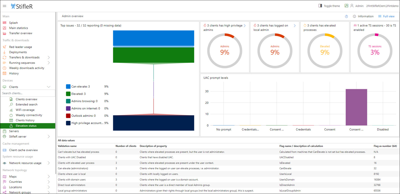 The Elevation status page provides an administrative overview of the account elevation status and terminal service sessions of the currently logged on users. This information includes which clients currently have high elevation permissions, and currently logged-on local admins. The table at the bottom of the page lists the various client properties and counts of machines with those properties.