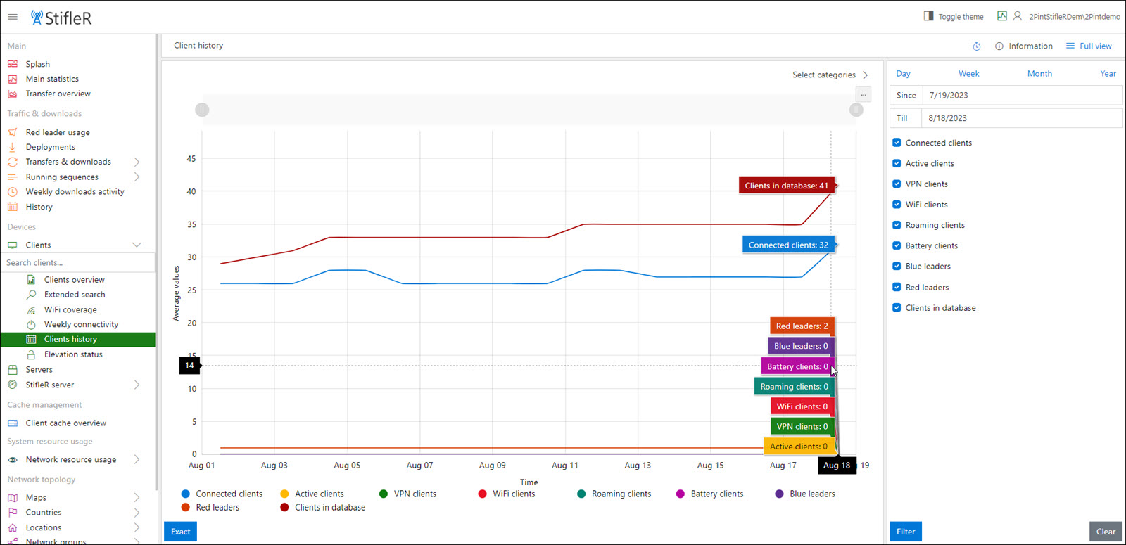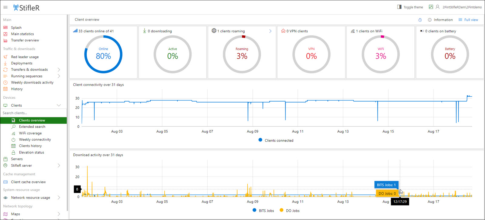 Online – displays the percentage of clients currently connected and reporting to the StifleR server. Active – displays the percentage of clients currently downloading content. Roaming – displays the percentage of clients considered roaming. VPN – displays the percentage of clients currently connected to VPN. Wi-Fi – displays the percentage of clients connected to Wi-Fi. Battery – displays the percentage of clients currently running on battery. Client connectivity over 31 days – displays a running line chart of the number of clients connected over the past 31 days. Download activity over 31 days – displays a running bar chart of client download activity over the last 31 days.